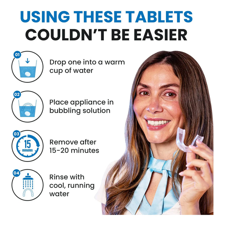 Nuestras pastillas utilizan una mezcla única de ingredientes que actúan rápidamente para descomponer la placa y las manchas. Al disolverse en agua, liberan un poderoso agente limpiador que penetra en cada rincón de tus dispositivos dentales, eliminando bacterias y dejando un acabado impecable.