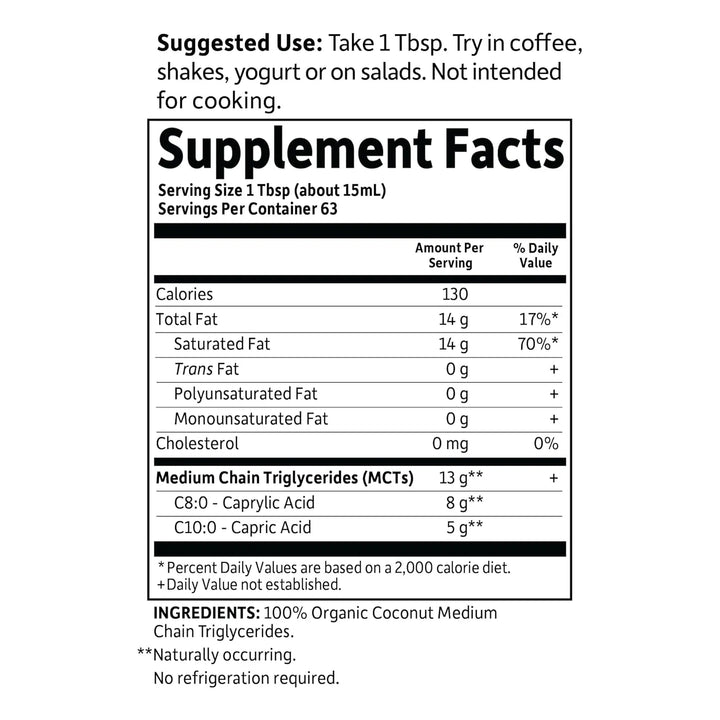 ¿Sabías que los MCT (triglicéridos de cadena media) son conocidos por su capacidad para convertirse rápidamente en energía? Nuestro aceite de coco MCT contiene 13g de MCT por porción, incluyendo ácidos caprílicos y cápricos, que son absorbidos directamente por el hígado y convertidos en combustible para tu cerebro y cuerpo. Ideal para dietas keto y paleo, este producto es vegano, sin gluten y libre de ingredientes artificiales. ¿No sería maravilloso sentirte más enfocado y lleno de vitalidad sin comprometer tu bienestar?