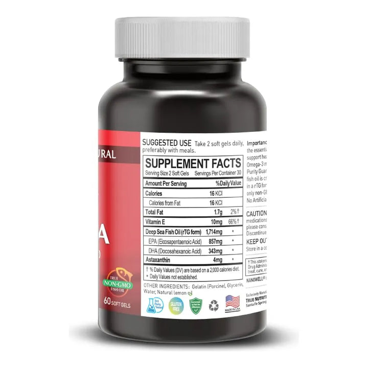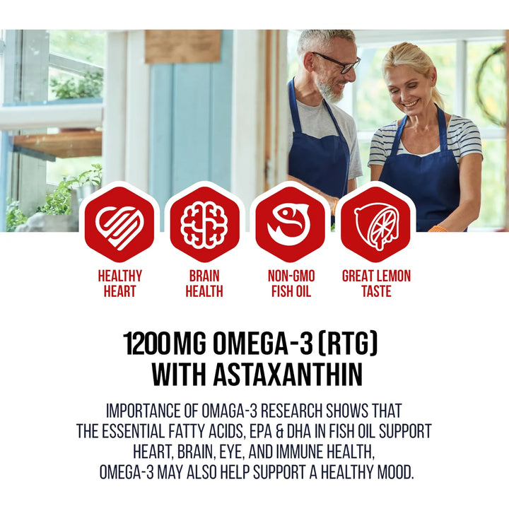Imagina un suplemento que no solo cuida de tu corazón y cerebro, sino que también protege tu piel y ojos de los daños diarios. Nuestro Aceite de Pescado Omega-3 con Astaxantina y Vitamina E es la solución que tu cuerpo necesita para mantenerse fuerte, vital y lleno de energía. Cada cápsula está diseñada para ofrecerte los mejores nutrientes, obtenidos de manera sostenible y procesados para garantizar su máxima pureza.