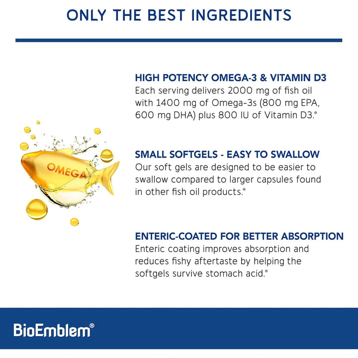 Imagina despertar cada día con energía renovada, claridad mental y un corazón fuerte. ¿Te gustaría sentirte más ágil, con una piel radiante y menos molestias en tus articulaciones? El Aceite de Pescado Omega-3 2000 mg de BioEmblem está diseñado para brindarte estos beneficios y más, gracias a su fórmula avanzada y cápsulas fáciles de tomar.