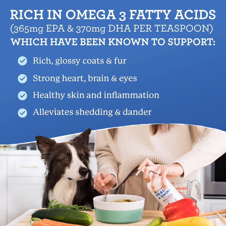 ¿Sabías que los ácidos grasos Omega 3 son esenciales para prevenir problemas de piel, reducir la inflamación y apoyar el desarrollo cognitivo de tu mascota? Nuestro aceite de pescado está especialmente formulado para perros de todas las edades y razas, garantizando una absorción óptima de nutrientes sin el desorden de las cápsulas. Su dispensador de bomba hace que administrarlo sea tan fácil como agregarlo a su comida favorita.
