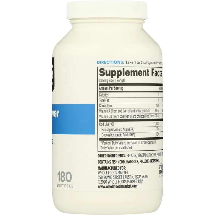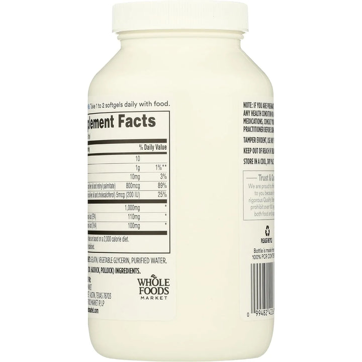 Imagina un suplemento que no solo nutre tu cuerpo, sino que también protege tu salud de manera natural. El Aceite de Hígado de Bacalao Noruego 1000 mg es una fuente concentrada de vitaminas A y D, junto con ácidos grasos Omega-3 (EPA y DHA), esenciales para tu bienestar diario. Este producto, presentado por Whole Foods Market, está elaborado con bacalao de aguas frías noruegas, garantizando pureza y calidad en cada cápsula.