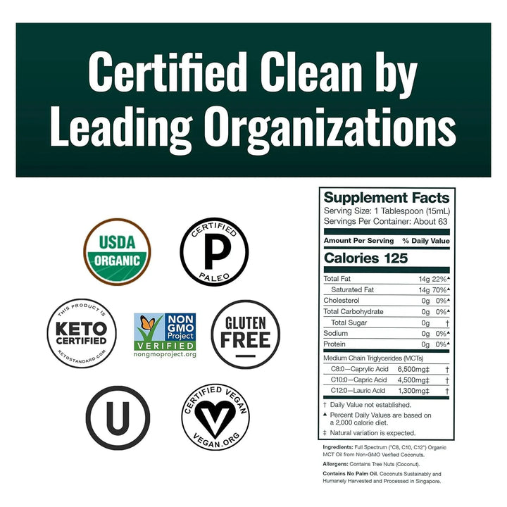 ¿Te preocupa la calidad de lo que consumes? Nuestro aceite MCT está certificado por USDA, libre de OMG y probado en laboratorios independientes para garantizar su pureza. Cada porción de 1 cucharada contiene 14 gramos de MCT de espectro completo (C8, C10 y C12), perfecto para mantener tus niveles de energía sin carbohidratos ni azúcares añadidos. Además, su envase de vidrio puro y reciclable refleja nuestro compromiso con el planeta. ¡Tu salud y el medio ambiente lo agradecerán!