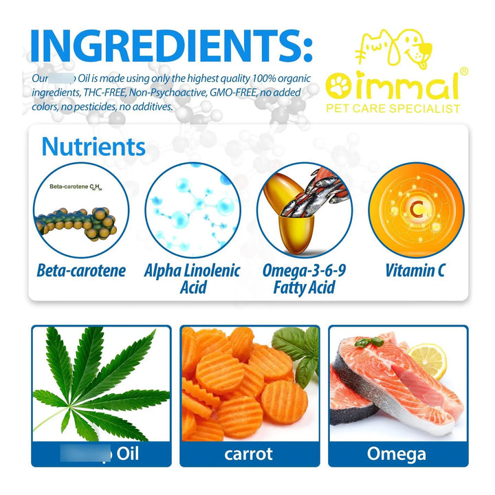 Los ácidos grasos Omega 3, 6 y 9 penetran en el organismo de tu perro, reduciendo la inflamación y lubricando sus articulaciones para un movimiento más suave. La vitamina E y C actúan como antioxidantes, mientras que el aceite de cáñamo promueve la relajación natural.