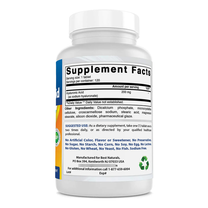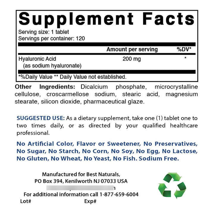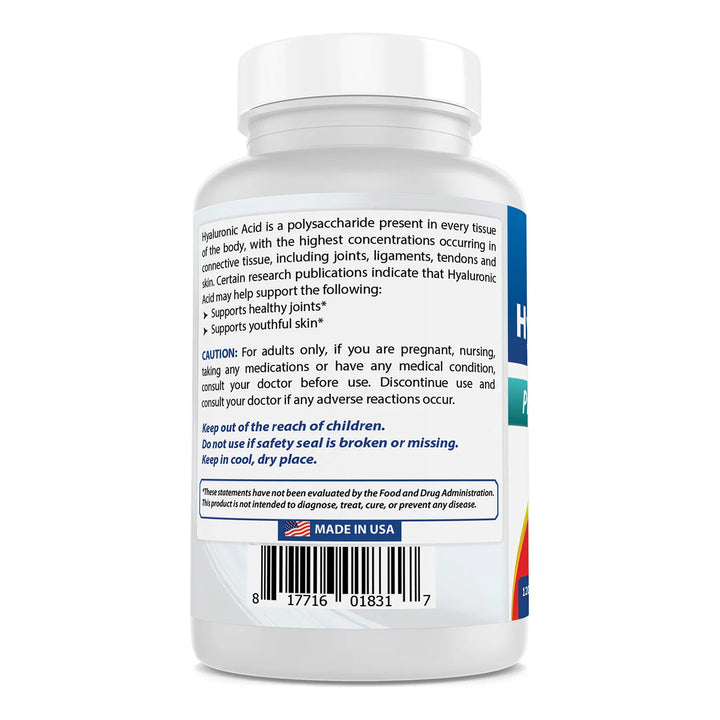 Cada tableta contiene 200 mg de ácido hialurónico puro, libre de ingredientes artificiales y alergénicos. Sin gluten, sin OMG y fabricado en Estados Unidos en instalaciones certificadas por la FDA, este producto es la elección perfecta para quienes buscan resultados visibles y duraderos. ¿Por qué conformarte con menos cuando puedes darle a tu cuerpo lo mejor?