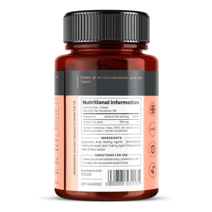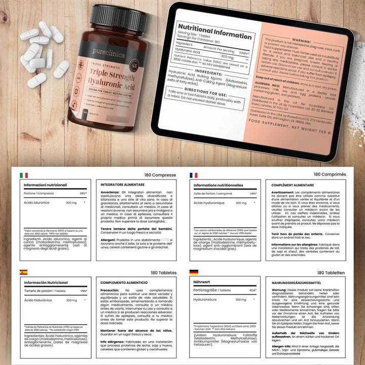 - 🔬 Pureza Garantizada: 300 mg de ácido hialurónico 99.4% puro en cada tableta - sin rellenos ni ingredientes cuestionables