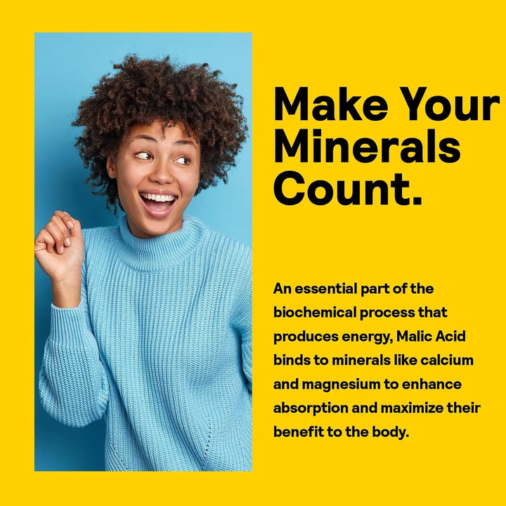 El Ácido Málico es un componente esencial en el ciclo de Krebs, el proceso bioquímico que genera energía en las células. Al suplementar con 800 mg diarios, estás proporcionando a tu cuerpo el combustible necesario para optimizar la producción de ATP (la molécula de energía), lo que se traduce en mayor resistencia física y mental. Además, su capacidad para unirse a minerales como el calcio y el magnesio mejora su absorción, apoyando no solo la energía sino también la salud ósea y muscular.