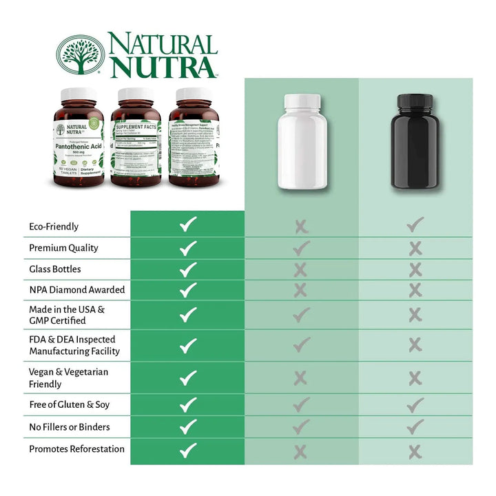 - ♻️ Absorción superior: La tecnología de liberación lenta maximiza cada miligramo de vitamina B5.