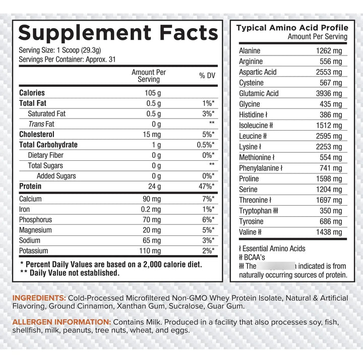 Procesado en frío para preservar cada gramo de nutrientes, este aislado de proteína es libre de rellenos artificiales y azúcares añadidos. Cada porción de 24.87 gramos te brinda la pureza que tu cuerpo merece, ayudándote a recuperarte más rápido, construir músculo magro y mantenerte saciado por más tiempo. ¿Lo mejor? Su delicioso sabor a bollo de canela hace que cada toma sea un momento que esperar con ansias.