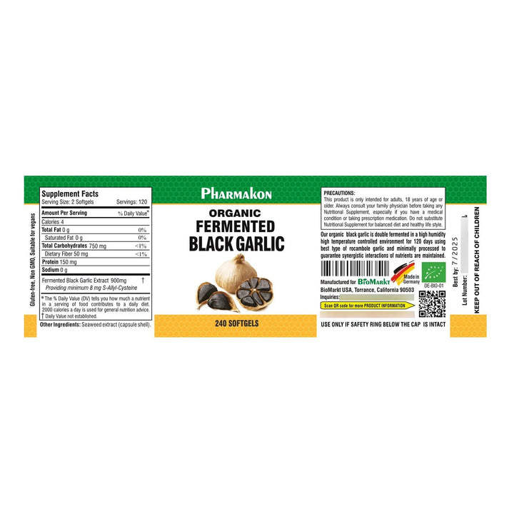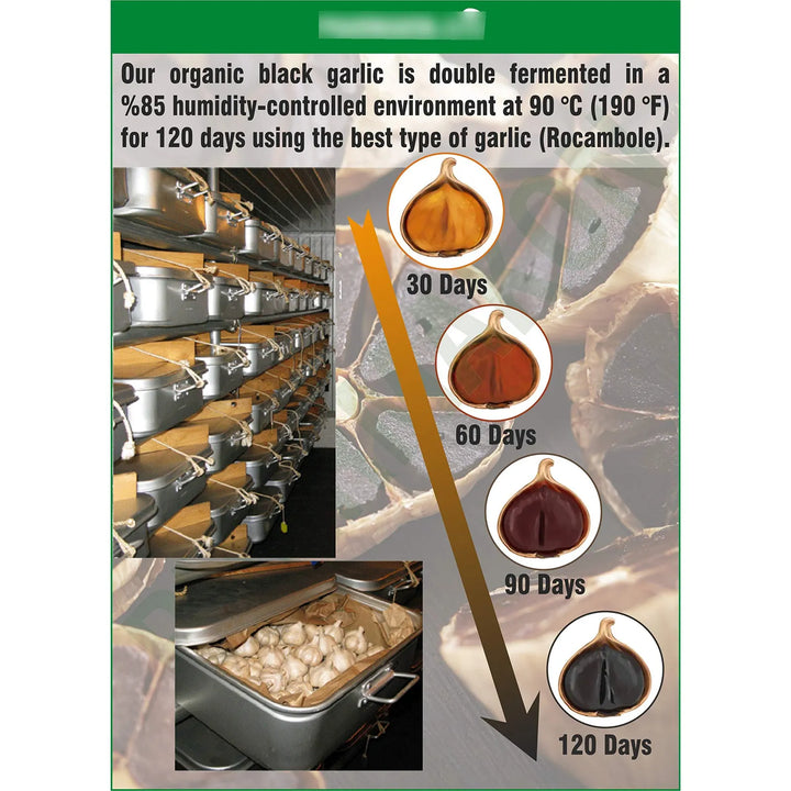 El ajo negro envejecido se produce mediante un proceso de fermentación controlada del ajo blanco tradicional. Este proceso no solo le da su característico color negro, sino que también aumenta su contenido de antioxidantes y compuestos bioactivos, como la S-alilcisteína, que es más biodisponible y efectiva que los compuestos del ajo fresco.
