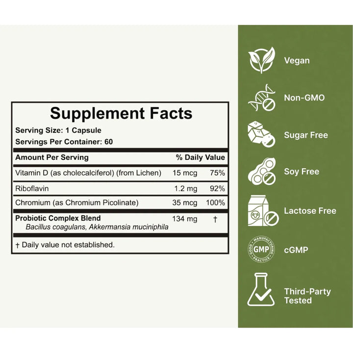 Imagina despertar cada día con más energía, sintiéndote satisfecho después de comer y viendo cómo tu cuerpo se transforma sin esfuerzos extremos. Nuestra combinación exclusiva de Akkermansia Muciniphila y Bacillus Coagulans trabaja en sinergia para fortalecer tu barrera intestinal, reducir inflamaciones y ayudarte a absorber mejor los nutrientes. Además, está enriquecido con vitaminas B2, D3 y cromo para potenciar tu sistema inmunológico y regular los niveles de azúcar en sangre.