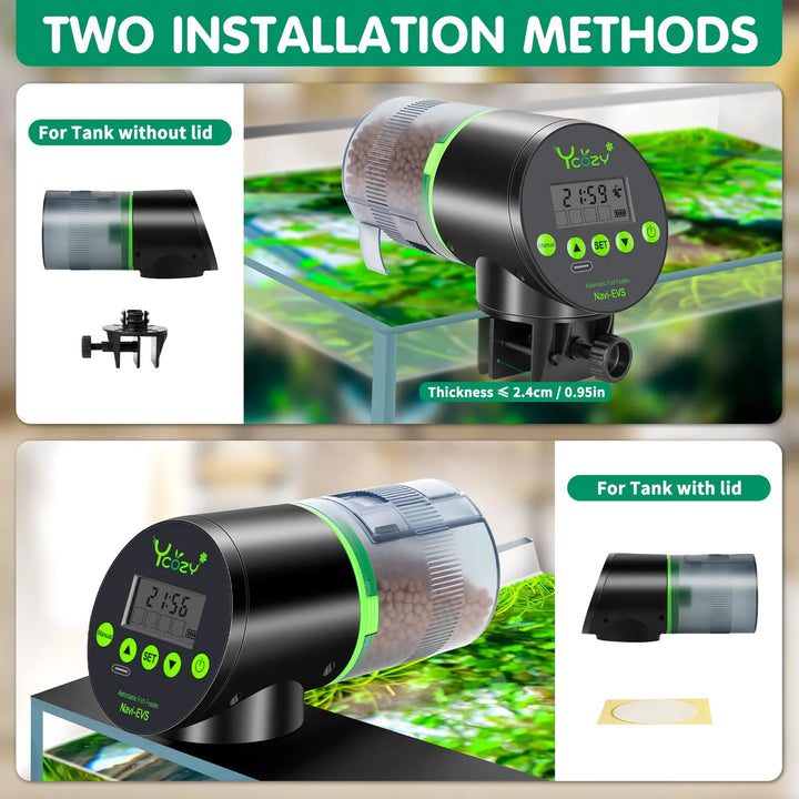 - Instala el alimentador en el acuario usando la abrazadera o cinta adhesiva.