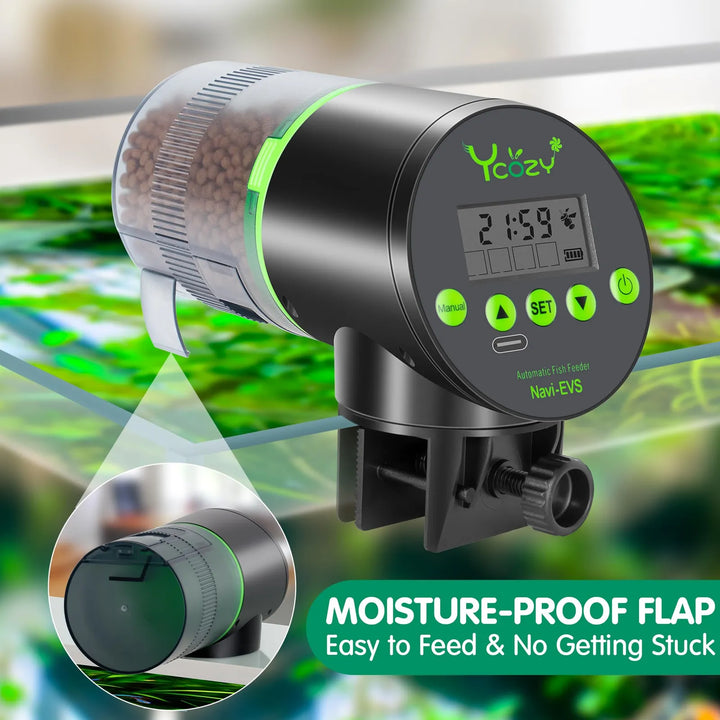 El alimentador automático utiliza un sistema de rotación silenciosa para dispensar la cantidad exacta de alimento programada. Simplemente carga el compartimento con comida, ajusta el control deslizante para la porción deseada y programa el horario de alimentación. El modo de cuenta regresiva te permite elegir intervalos de 8, 12, 24 o 48 horas, asegurando que tus peces reciban su comida incluso cuando no estés en casa.