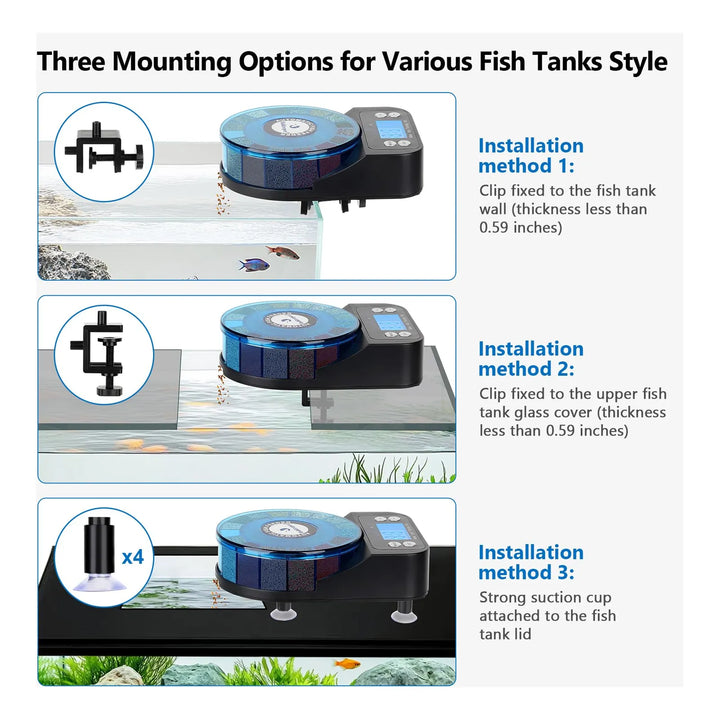 - Coloca el alimentador en el borde del acuario usando las ventosas o la abrazadera incluida.