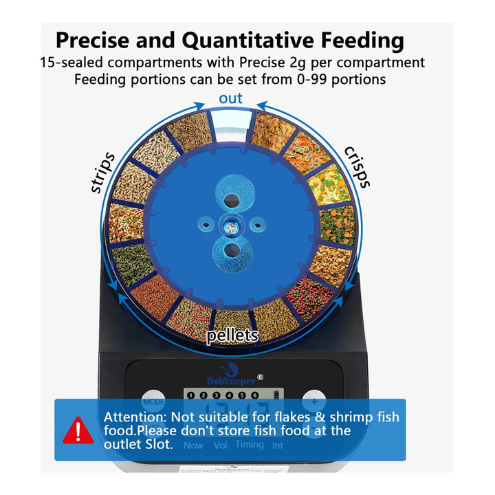Este alimentador automático utiliza un sistema de dispensación de precisión que garantiza que cada porción de alimento sea la correcta. Las 16 rejillas selladas evitan la humedad y mantienen los alimentos frescos, mientras que los modos de temporizador te permiten programar las comidas según las necesidades de tus peces. Simplemente carga los compartimentos, configura el temporizador y olvídate de preocupaciones.