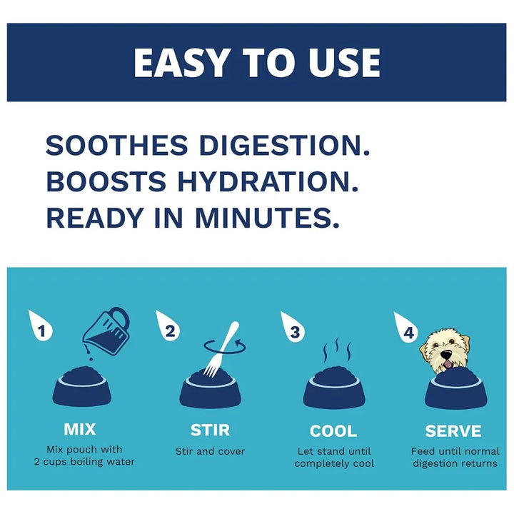 Formulado con ingredientes 100% de grado humano, como pollo sin jaula, arroz blanco y una mezcla de electrolitos, este alimento no contiene subproductos, gluten ni sabores artificiales. Es la opción perfecta para perros que necesitan una dieta suave después de cirugías, viajes o cambios en su rutina. ¿Por qué arriesgarse con comidas caseras que pueden no ser equilibradas? Confía en lo que los veterinarios recomiendan y dale a tu perro lo mejor.