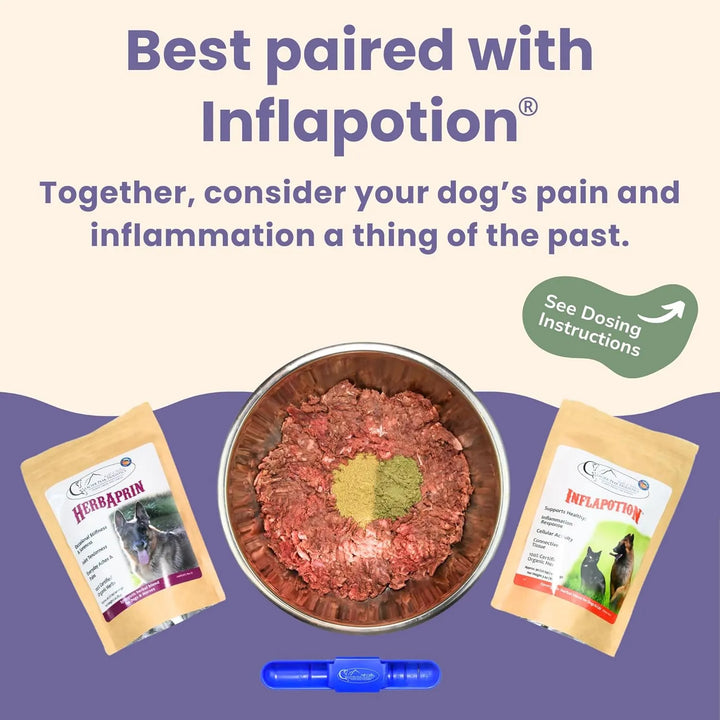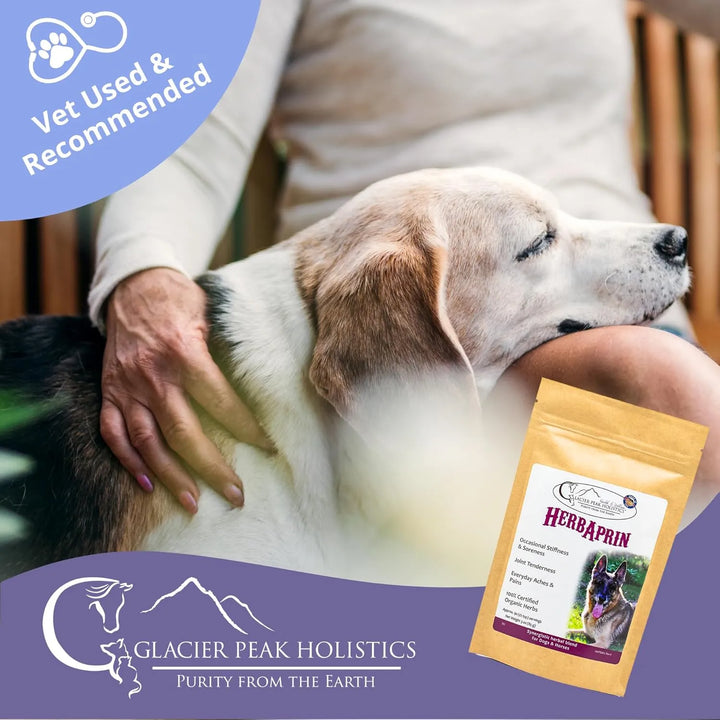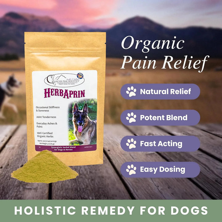 ¿Tu perro sufre de artritis, dolores articulares o rigidez? Imagina verlo feliz, activo y libre de dolor nuevamente. Nuestra mezcla de hierbas orgánicas Glacier Peak Holistics Herbaprin está diseñada para brindar un alivio natural y efectivo, sin los efectos secundarios de los medicamentos tradicionales. Con más de 30 años de resultados comprobados, esta fórmula es la elección inteligente para dueños que priorizan el bienestar de sus mascotas.