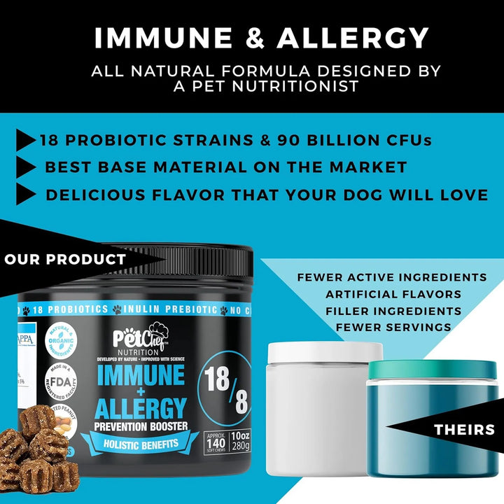 ¿Tu perro no deja de rascarse, lamer sus patas o sufrir de alergias? Sabemos lo doloroso que es ver a tu compañero peludo incómodo y sin poder ayudarlo. Por eso, presentamos Pet Chef Respiratory Immune + Remedio contra la alergia del perro, una solución holística y natural diseñada para aliviar la picazón, fortalecer su sistema inmunológico y mejorar su salud respiratoria. ¡Dale a tu mascota el alivio que se merece!