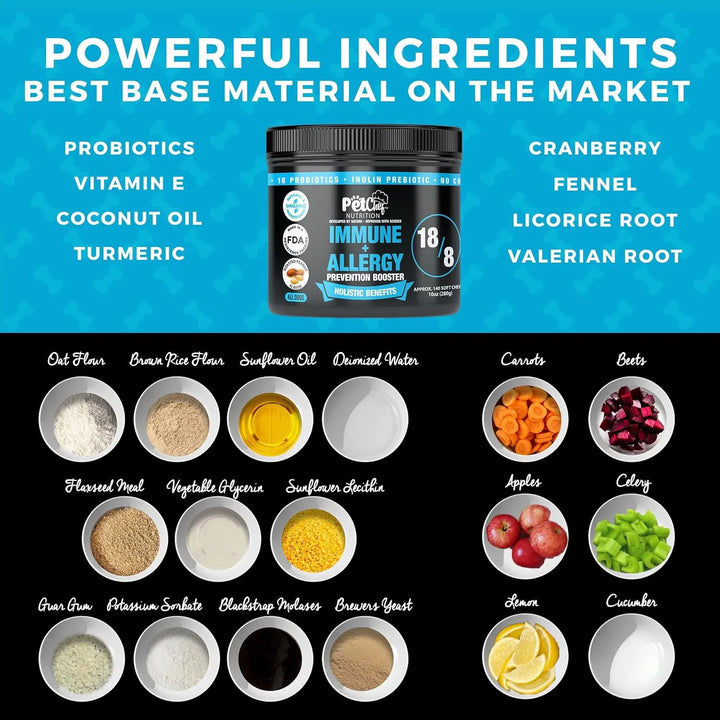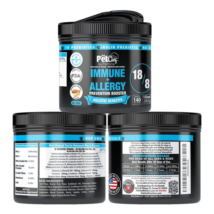 Nuestro producto actúa regulando la respuesta de histamina, reduciendo la picazón y la inflamación. Los probióticos y Omega-3 fortalecen el sistema inmunológico y mejoran la salud intestinal, mientras que los ingredientes naturales aseguran un alivio seguro y efectivo.