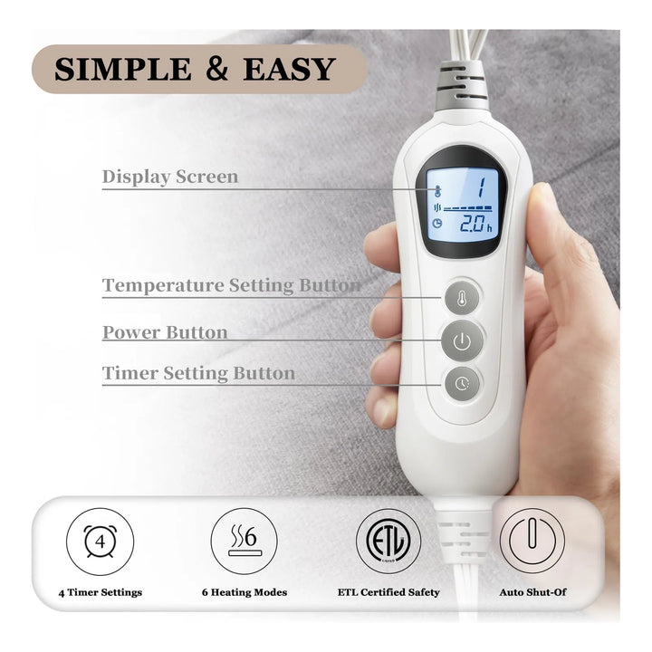 Diseñada para quienes buscan comodidad y relajación, esta almohadilla térmica es tu aliada perfecta. Con 6 niveles de temperatura, puedes personalizar tu experiencia de calor desde 104°F hasta 140°F, asegurando que cada sesión sea exactamente lo que necesitas. ¿Lo mejor? Su apagado automático después de 120 minutos te garantiza seguridad y tranquilidad mientras disfrutas de un descanso reparador.