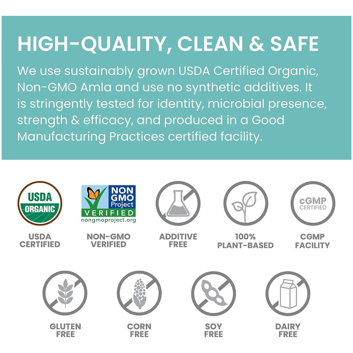 - Extracto de Amla Orgánico: Combina polvo de tallo y fruta para una mayor eficacia. 🌟