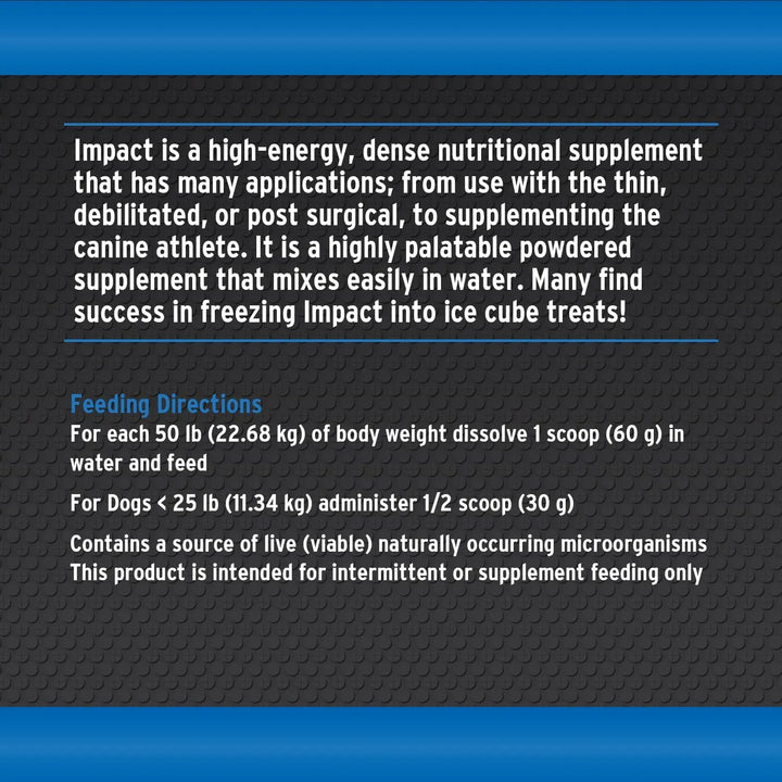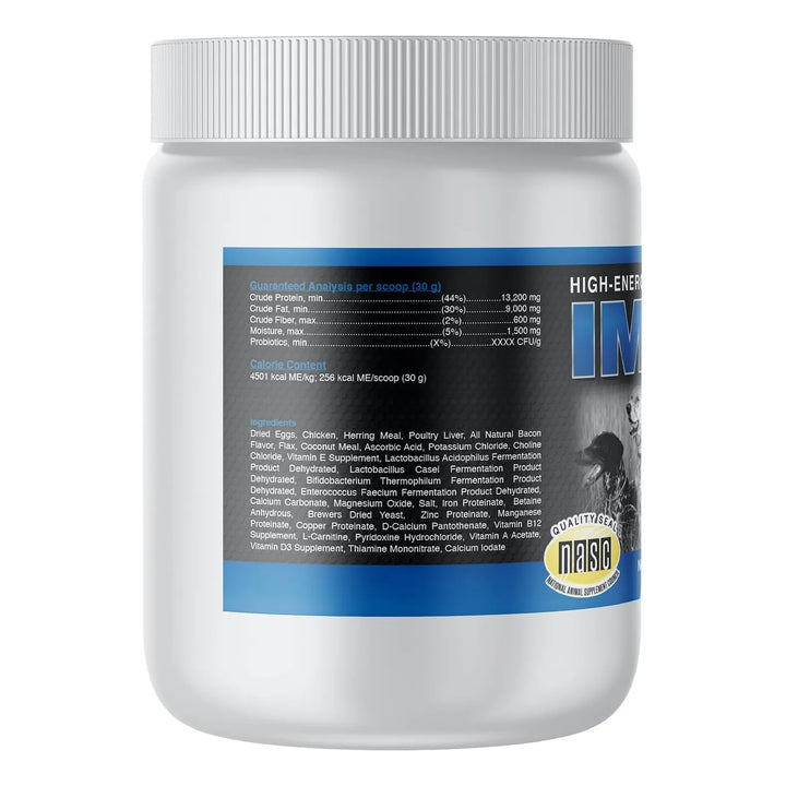 Annamaet Impact actúa como un complemento nutricional denso en energía, ideal para perros con altos requerimientos calóricos. Su fórmula equilibrada proporciona proteínas de fácil digestión, vitaminas y minerales esenciales, junto con probióticos que mejoran la absorción de nutrientes. Esto ayuda a mantener un peso saludable, fortalece el sistema inmunológico y promueve una recuperación más rápida en perros postquirúrgicos o con metabolismo acelerado.