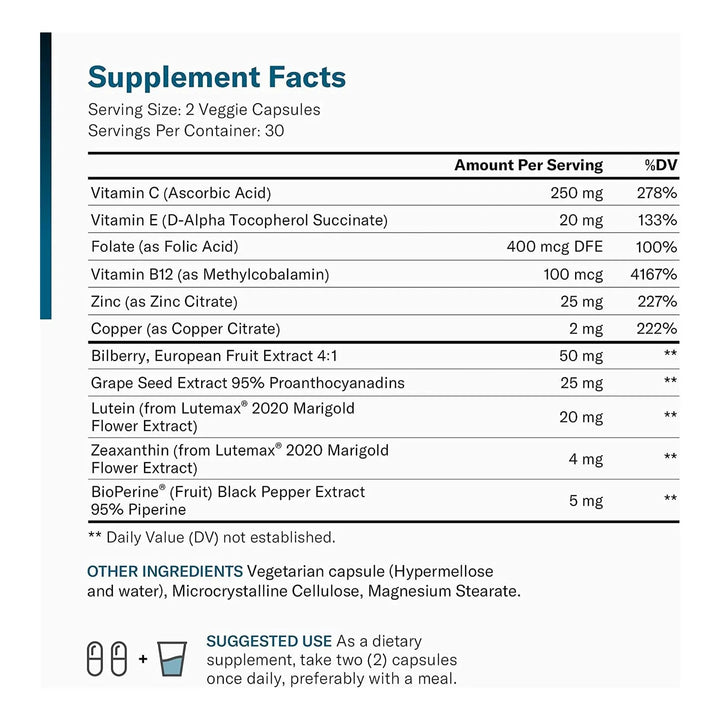 Imagina despertar cada mañana con ojos frescos, sin esa molesta sensación de ardor o sequedad. Nuestra fórmula avanzada, inspirada en el estudio AREDS 2, incluye Lutemax 2020, una combinación patentada de carotenoides que reduce la fatiga visual y mejora la calidad del sueño. Además, con vitamina C, E, B12 y minerales esenciales como zinc y cobre, estás proporcionando a tus ojos una defensa completa contra el envejecimiento y el estrés diario.