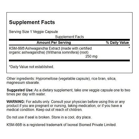 - Fórmula pura y potente: 250 mg de Ashwagandha KSM-66 por cápsula. 🌱