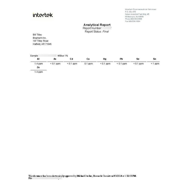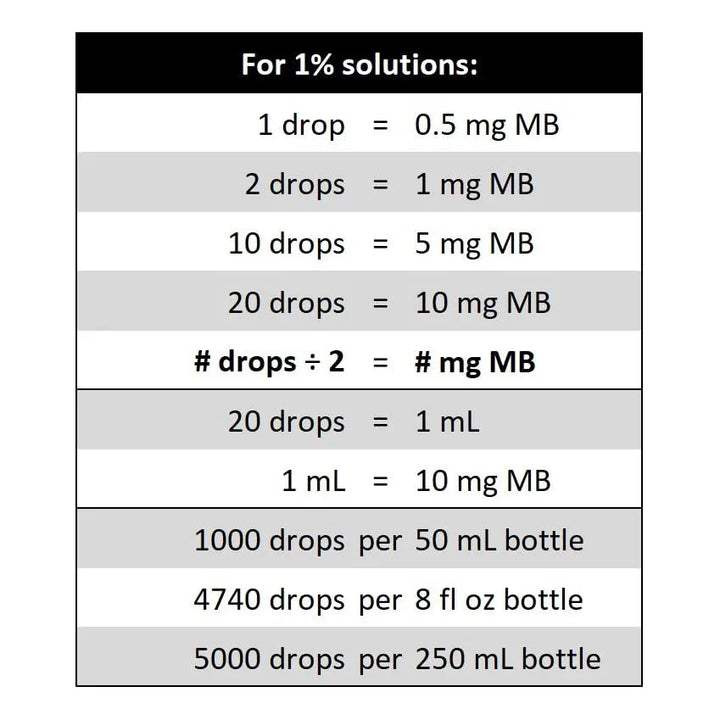 Cada gota de este producto contiene 0.5 mg de azul de metileno ultrapuro, libre de formaldehído y metales pesados como aluminio, arsénico, cadmio y plomo. ¿Por qué conformarte con menos cuando puedes tener lo mejor? La botella cuentagotas de vidrio no solo facilita su uso, sino que también garantiza que cada aplicación sea precisa y segura.