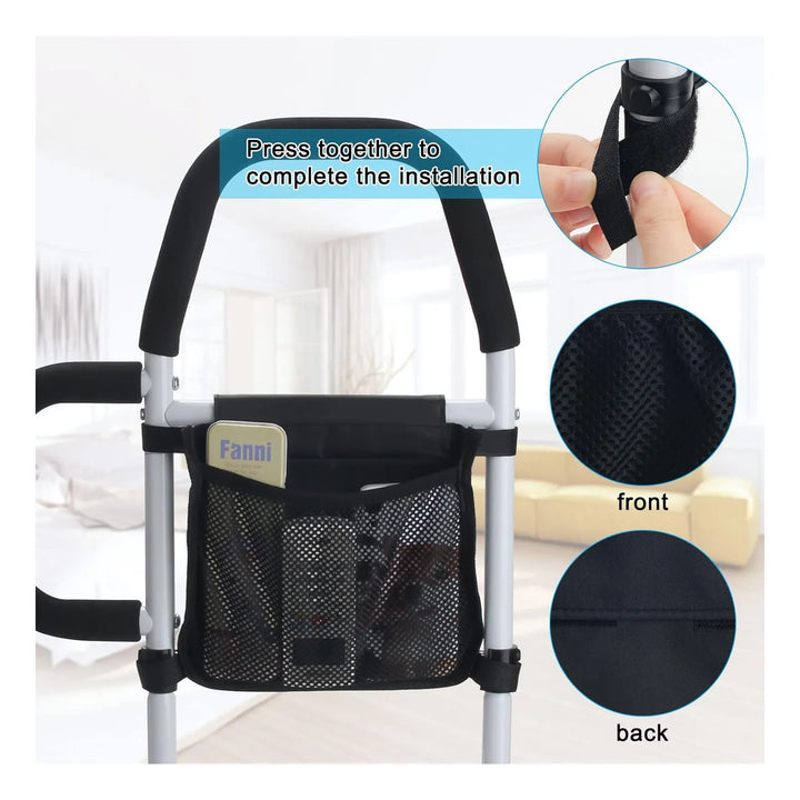 Esta barandilla se coloca bajo el colchón, ajustándose firmemente para brindar soporte lateral. Las barras de agarre permiten que el usuario se impulse con seguridad al cambiar de posición, mientras que el bolsillo almacena objetos personales. Su estructura metálica distribuye el peso de manera uniforme, evitando desplazamientos.