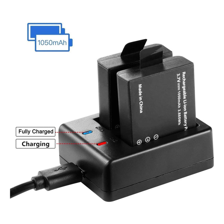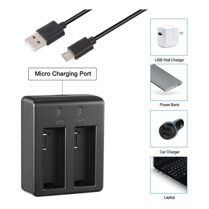 Este paquete está diseñado para mantener tu cámara de acción funcionando cuando más lo necesitas. Cada batería se carga individualmente en el cargador dual, que detecta automáticamente cuando está llena para evitar sobrecargas. El proceso es simple: inserta las baterías en el cargador, conecta el cable micro USB a una fuente de poder, y espera a que la luz roja se vuelva azul. ¡Así de fácil!
