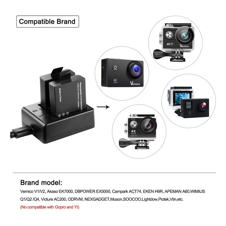 No importa qué modelo de cámara deportiva tengas, nuestras baterías están diseñadas para funcionar con una amplia gama de marcas y modelos. Desde AKASO hasta Dragon Touch, hemos cubierto las marcas más populares para que no tengas que preocuparte por encontrar el repuesto correcto. ¡Solo instala, carga y listo!