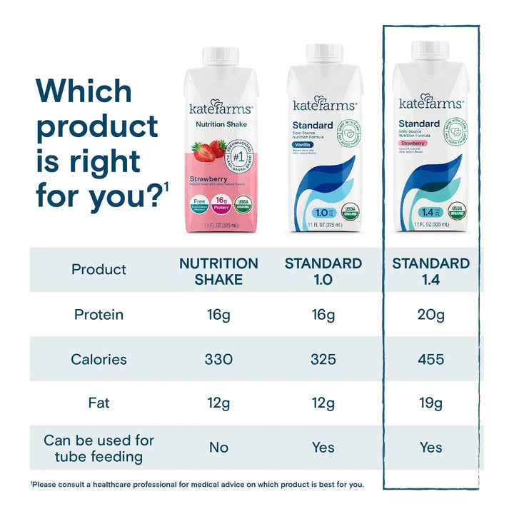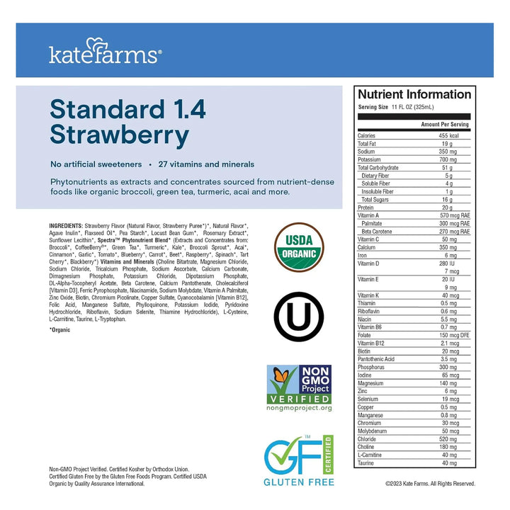 No todos los batidos son iguales. KATE FARMS se distingue por su compromiso con la calidad y la transparencia. Cada botella está certificada como orgánica por el USDA, libre de OMG, gluten y alérgenos comunes. Además, está enriquecida con fitonutrientes de superalimentos como brócoli orgánico, té verde y acai, potenciando tu salud desde dentro.