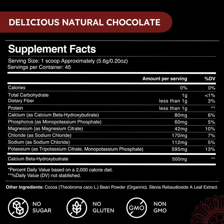 Formulada con cetonas exógenas respaldadas por la ciencia, esta bebida no solo te ayuda a entrar en cetosis más rápido, sino que también apoya tu claridad mental y energía sostenida. El sabor indulgente a chocolate, gracias al polvo de grano de cacao orgánico, hace que hidratarse sea un placer, sin el regusto salado de otros suplementos. Y lo mejor de todo: sin azúcar, sabores artificiales, gluten ni OMG. ¡Es el compañero perfecto para tu estilo de vida saludable!