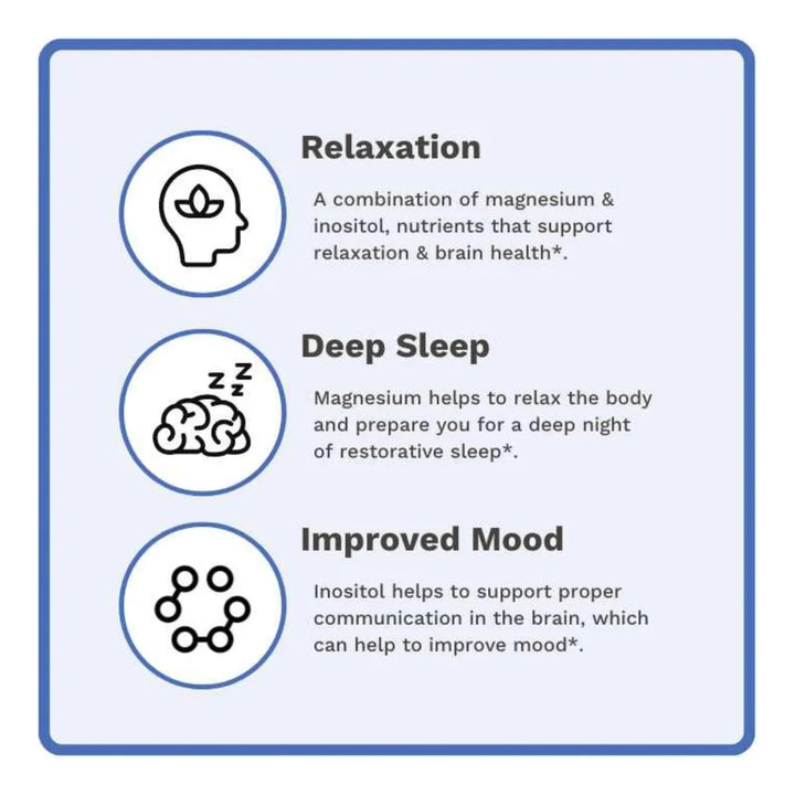 El glicinato de magnesio actúa directamente sobre tu sistema nervioso, promoviendo la relajación muscular y mental. El inositol potencia este efecto, apoyando la regulación de neurotransmisores como la serotonina. Juntos, trabajan para: