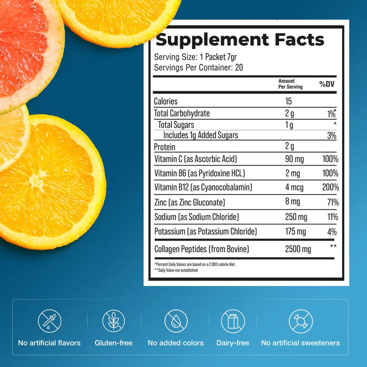 Al disolver el polvo en agua, obtienes una bebida rica en electrolitos que repone los minerales esenciales perdidos durante la actividad física o el estrés diario. La vitamina C y el zinc fortalecen tu sistema inmunológico, mientras que los péptidos de colágeno promueven la regeneración celular para una piel más firme y un cabello más fuerte.