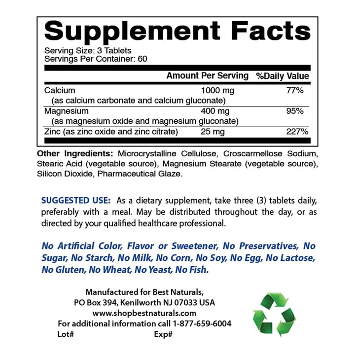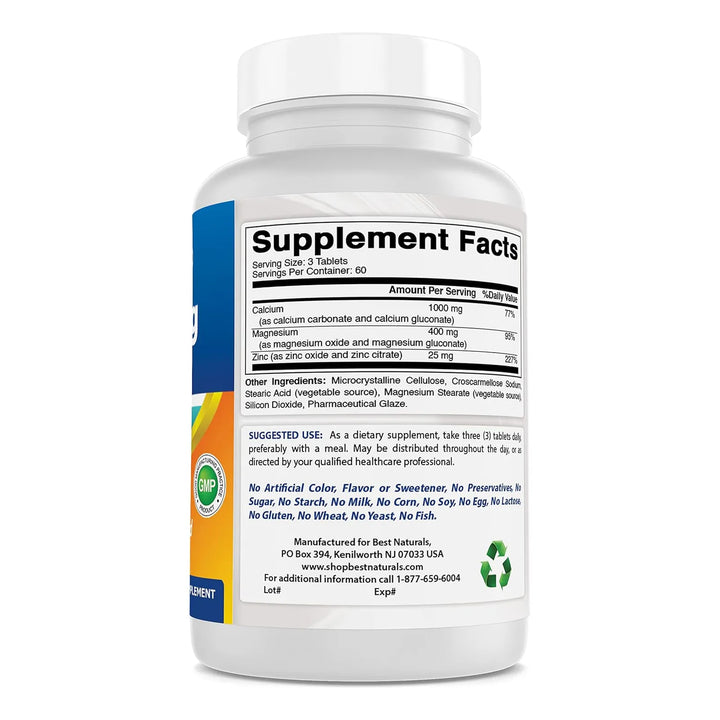 Fórmula Potente: 1000mg de calcio + 400mg de magnesio + 25mg de zinc por porción diaria (3 tabletas) 💯