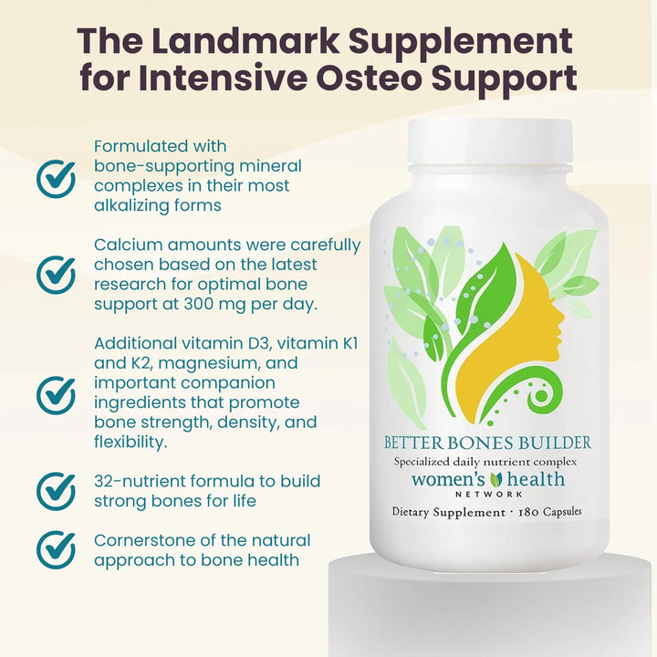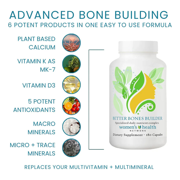 ¿Te preocupa la debilidad en tus huesos o el riesgo de osteoporosis? Imagina una solución que no solo fortalece tus huesos, sino que también nutre tu cuerpo desde adentro. Better Bones Builder es la fórmula intensiva de 32 ingredientes diseñada por la Dra. Susan Brown, pionera en salud ósea natural. Con décadas de investigación, esta fórmula combina lo mejor de la ciencia y la naturaleza para ofrecerte huesos fuertes de por vida.