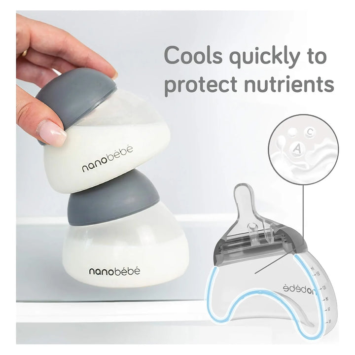 Los biberones Nanobebe están diseñados para preservar la calidad de la leche materna desde el primer momento. Su forma única permite un calentamiento uniforme y rápido, evitando puntos calientes que puedan dañar los nutrientes. El pezón de silicona con crestas evita que se colapse, asegurando un flujo constante y cómodo para tu bebé.