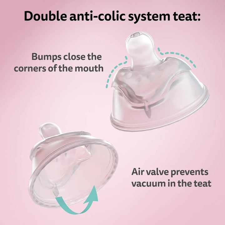 - 🛡️ Doble protección anticólicos: Tetina ergonómica y válvulas de aire que evitan la ingesta de aire y previenen gases.