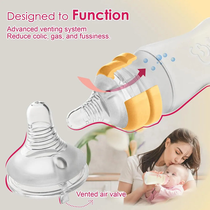 Cada biberón está fabricado con materiales seguros y libres de BPA, garantizando que solo lo mejor toque los labios de tu bebé. La silicona ultrasuave no solo imita la sensación de la piel de mamá, sino que también reduce la entrada de aire, minimizando los molestos cólicos y gases. ¿Sabías que el sistema de ventilación avanzado de estos biberones ayuda a equilibrar el aire interior y exterior? Esto significa menos inquietud para tu bebé y más tranquilidad para ti.