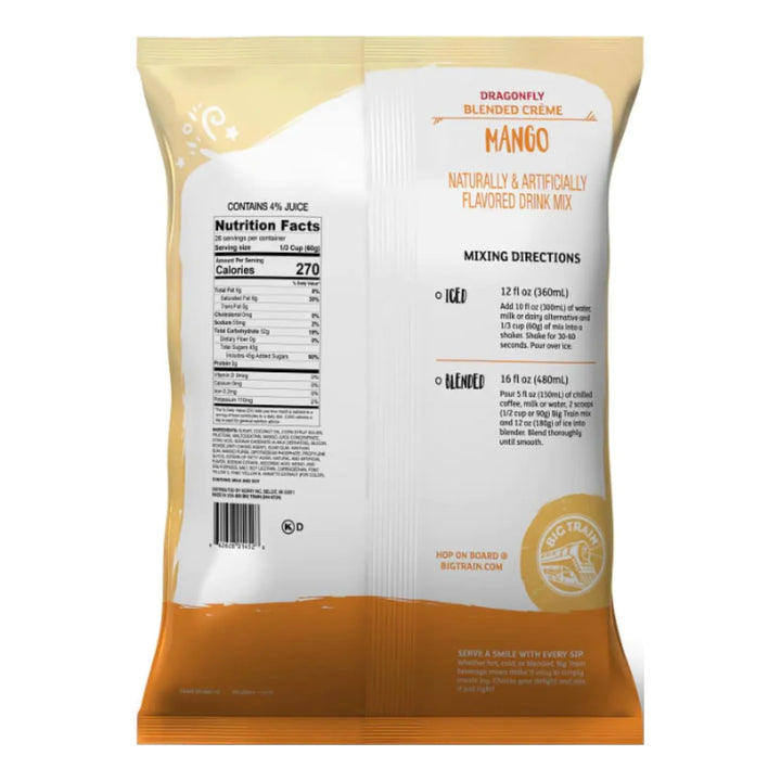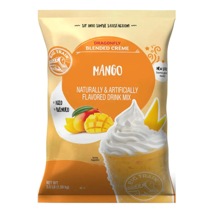 - Abre el paquete de Big Train Dragonfly Mezcla de Bebida de Crema Mezclada de Mango.