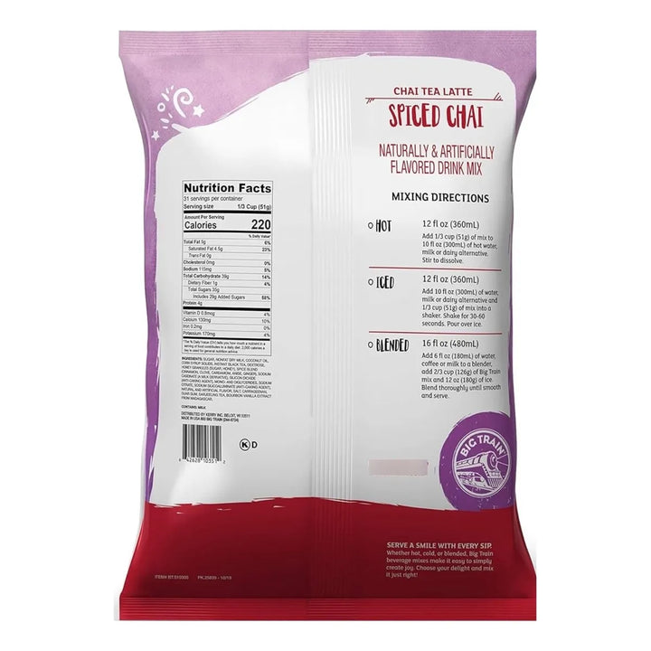 El Big Train Spiced Instant Chai Tea Latte Mix está diseñado para disolverse fácilmente en agua caliente o fría, liberando instantáneamente su mezcla de sabores. Sus ingredientes cuidadosamente seleccionados se combinan para ofrecer una textura cremosa y un aroma irresistible, sin necesidad de añadir ingredientes adicionales. Así, logras una experiencia gourmet en segundos.