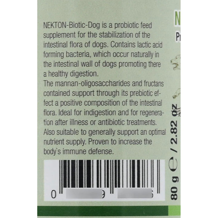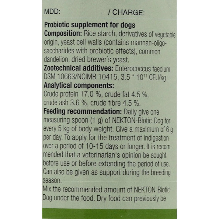 El Biotic-Dog combina manano-oligosacáridos (prebióticos) y levadura para estimular las bacterias beneficiosas en el intestino de tu perro. Estos componentes ayudan a descomponer los alimentos de manera más eficiente, reduciendo la inflamación y mejorando la absorción de nutrientes. ¡Es como un ejército microscópico trabajando para su salud!