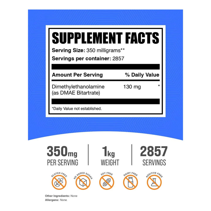 Imagina despertar cada día con más energía, claridad mental y un bienestar general que se refleja en todo lo que haces. Nuestro polvo de bitartrato DMAE, con 130 mg de dimetilaminoetanol por porción, está formulado para apoyar tu salud desde adentro. Sin sabores artificiales, sin alérgenos innecesarios y con la garantía de un producto probado y confiable.