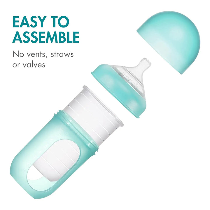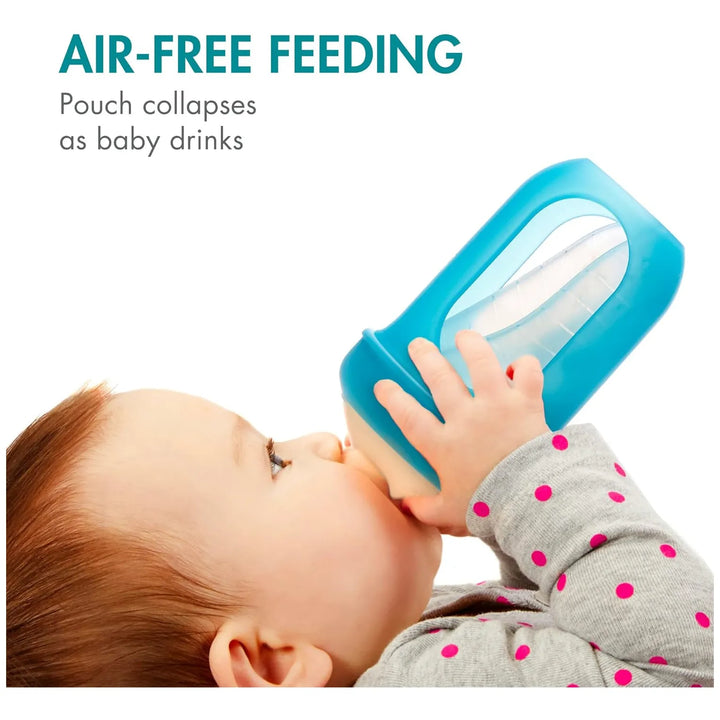 La bolsa se pliega a medida que tu bebé bebe, eliminando el aire que causa cólicos. Su silicona suave se adapta a la boca del bebé, mientras el pestillo asegura un agarre cómodo. Simplemente llena la bolsa, engancha la mamila, y listo. ¡Alimentación feliz en segundos!