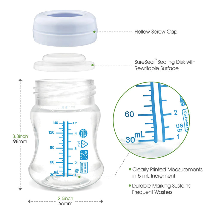 El disco de sellado SureSeal crea una barrera hermética al enroscar la tapa, evitando derrames incluso en movimiento. Las marcas de medición te permiten monitorear tu producción, mientras la tapa escribible ayuda a organizar la leche por fecha o nombre. Bombea directamente en la botella, ciérrala con el disco y guárdala en el refrigerador o congelador sin preocupaciones.