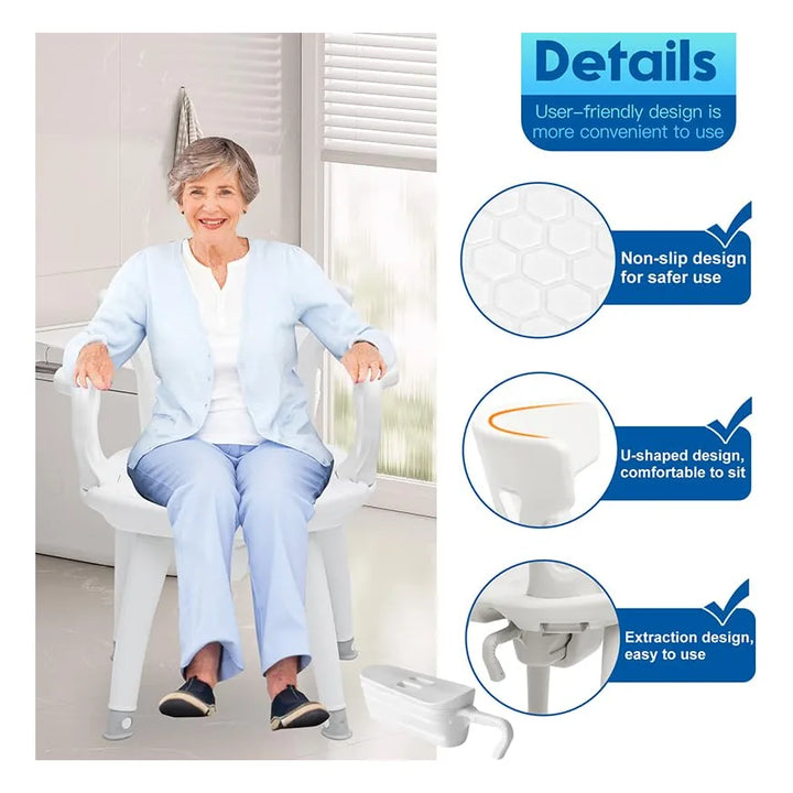¿Sabías que un asiento elevado puede hacer una diferencia enorme en tu calidad de vida? Para aquellos con problemas de rodilla o movilidad reducida, sentarse y levantarse del inodoro puede ser una tarea difícil. Nuestra silla de ducha incluye un asiento de inodoro elevado desmontable, que facilita estos movimientos y te brinda una experiencia más cómoda e higiénica. Además, las herramientas extraíbles, como el cubo de commode y el soporte de papel higiénico, están diseñadas para hacer tu vida más sencilla. ¡Porque mereces productos que se adapten a tus necesidades!