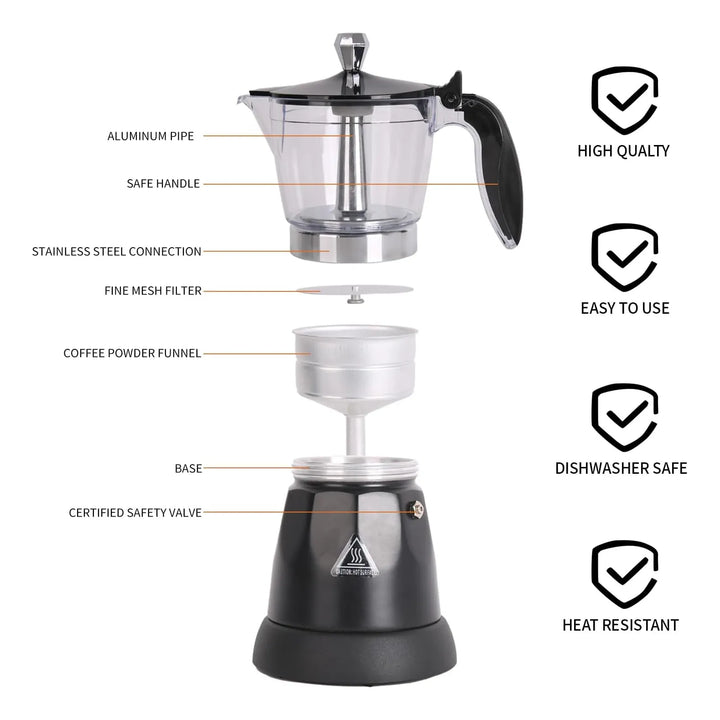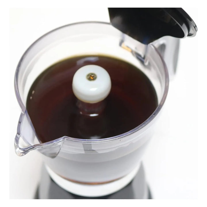 La magia comienza cuando llenas la caldera con agua fresca hasta la válvula de seguridad. Luego, añades café molido de alta calidad en el filtro, ensamblas la cafetera y la colocas en la base. Con solo presionar un botón, en 5 minutos tendrás un café aromático y lleno de sabor. Su sistema de apagado automático evita riesgos, mientras que el contenedor transparente te permite disfrutar del espectáculo de la preparación.