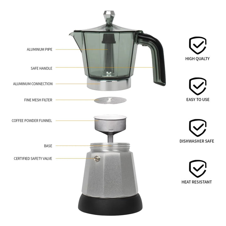 - 🌿 Contenedor transparente de lujo: Observa cada detalle del proceso de preparación y disfruta de un café espresso tradicional con facilidad.
